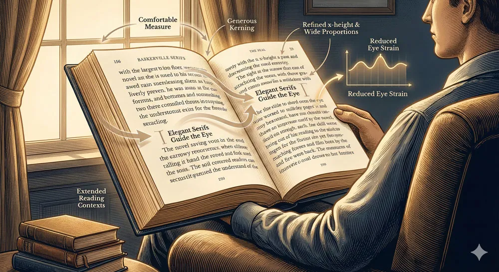 This combination of elegance and readability distinguished Baskerville from typefaces that prioritized one at the expense of the other. Baskerville proved that a typeface could be both beautiful and functionally excellent for reading.