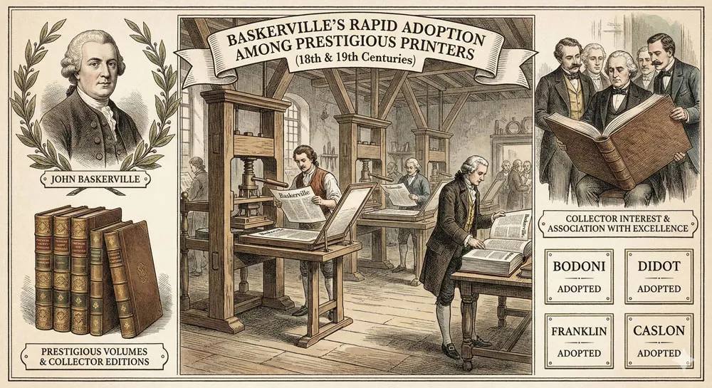 Baskerville typeface achieved rapid adoption among prestigious printers during the eighteenth and nineteenth centuries. The typeface was used by important printers throughout Europe and America. Baskerville-printed books became sought-after by collectors and readers.