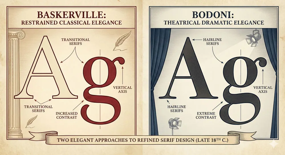 Around the same time that Baskerville was gaining prominence, Giambattista Bodoni in Italy was creating Bodoni typeface, which was similarly committed to elegance and refinement. Bodoni and Baskerville represent two different European approaches to refined serif typeface design.