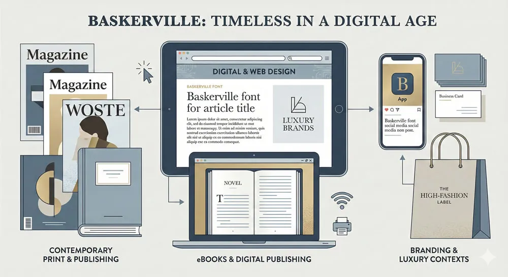 In contemporary contexts, Baskerville continues to be used in print design, in digital publishing, in branding contexts where elegance and refinement are valued. The typeface has successfully transitioned from physical print to digital contexts while maintaining its distinctive character.