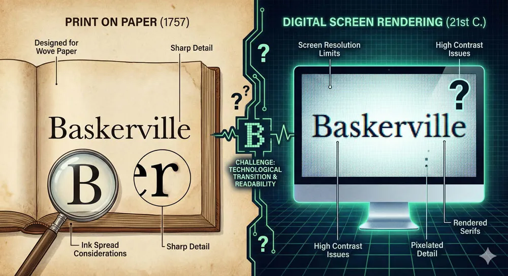 As typography has transitioned from physical print to digital screens, questions have arisen about how Baskerville functions in digital contexts. Baskerville was designed for printโ€”for ink on paper, for the specific printing technologies of the eighteenth century.