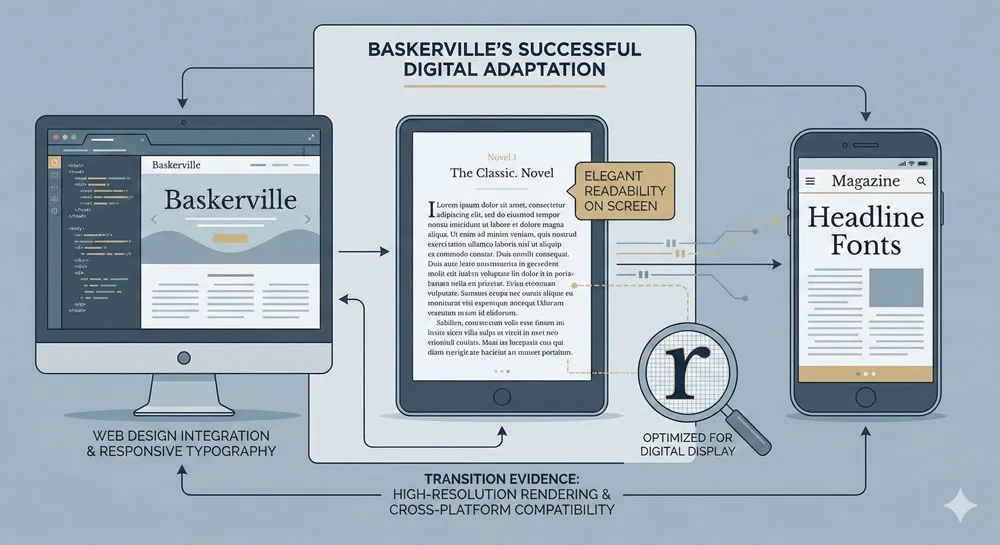 A: Baskerville functions well in digital contexts, though it functions differently than in print. The typeface has been successfully adapted for digital publishing, eBook readers, and web design. The high contrast and refined details remain effective in digital contexts.