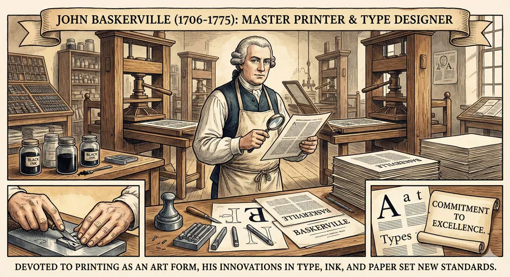 This comprehensive exploration traces John Baskerville’s life and revolutionary approach to printing, examines Baskerville typeface design characteristics and innovation, explores the typeface’s adoption and influence throughout the eighteenth to twentieth centuries, analyzes Baskerville’s role in print culture and book design, compares Baskerville to other serif typefaces, and ultimately asks: