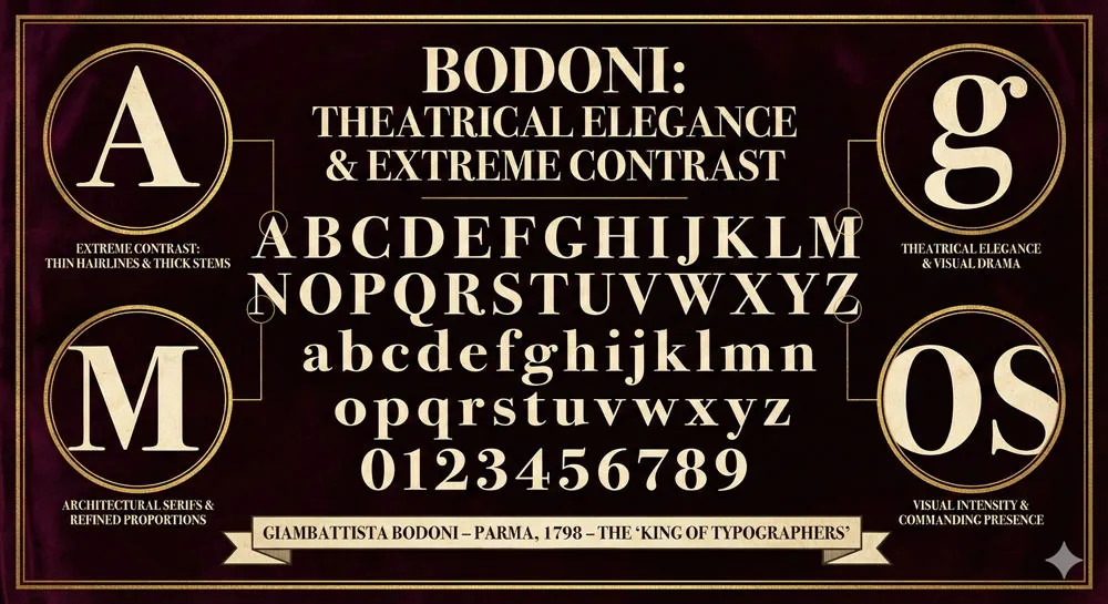 Bodoni’s Design Characteristics: Theatrical Elegance and Visual Intensity