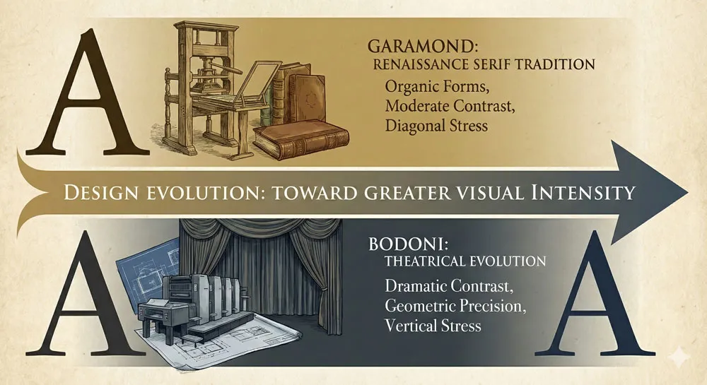 Garamond is an older serif typeface from the Renaissance printing tradition. Bodoni builds upon and extends that tradition while pushing toward greater visual drama. Bodoni represents an evolution of serif design toward greater theatrical intensity.