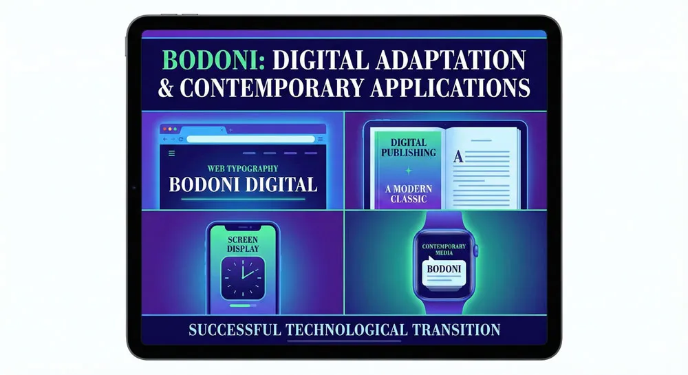 The transition to digital contexts has been relatively successful. Bodoni’s distinctive character translates well to digital environments. The typeface remains recognizable and prestigious in digital contexts.