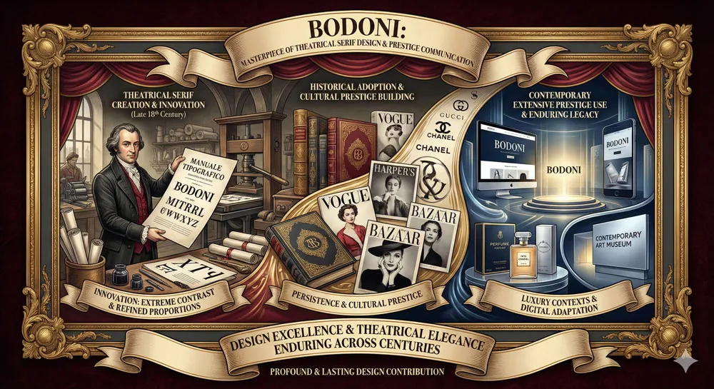 This comprehensive exploration traces Giambattista Bodoni’s life and design philosophy, examines Bodoni typeface characteristics and theatrical innovations, explores the typeface’s adoption and association with prestige and luxury, analyzes Bodoni’s role in prestige publishing and high-end design, compares Bodoni to other serif typefaces, and ultimately asks: