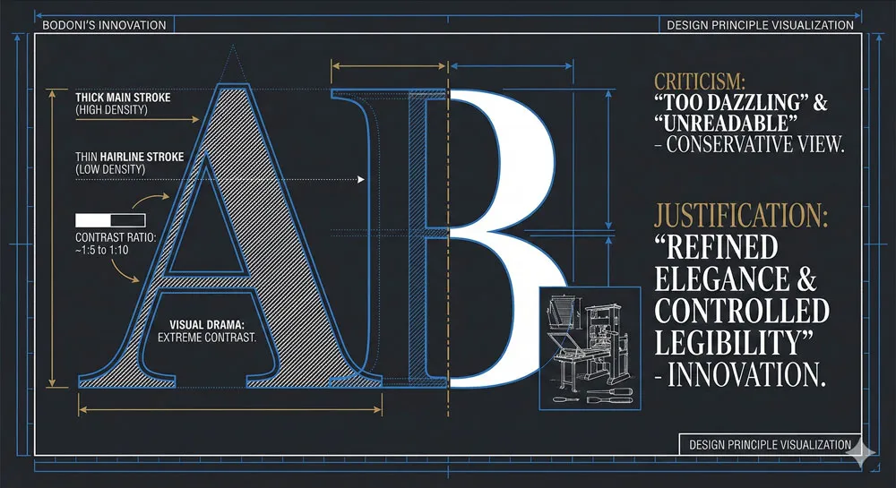 This theatrical approach distinguished Bodoni from contemporary designers. Bodoni was willing to push proportions to dramatic extremes. Bodoni created high contrast between thick and thin strokesโso extreme that some conservative critics questioned whether such high contrast could actually be legible.