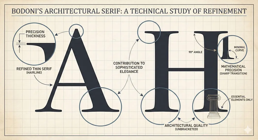 The serif design is not ornamental or excessive. Rather, the serifs are stripped to essential elements, refined to mathematical precision. This refined serif design distinguishes Bodoni from more ornamental serif designs and contributes to the impression of controlled elegance.