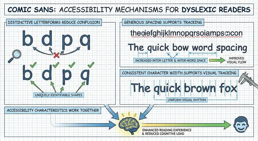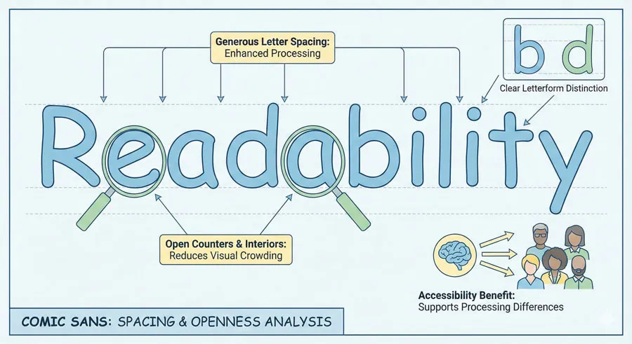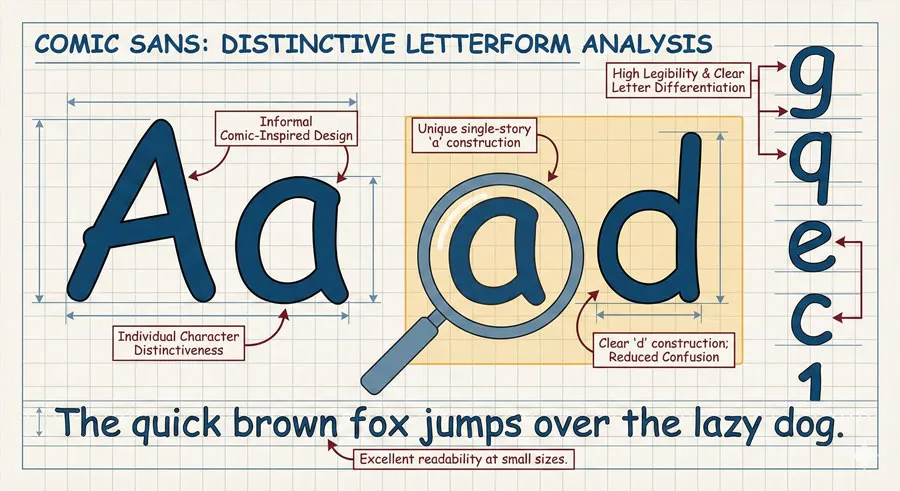 The typeface’s distinctive letterforms, generous spacing, and informal character create characteristics that support dyslexic readers. The letter “a” in Comic Sans looks distinctly different from the letter “d”. The spacing between letters is clear and generous. These characteristics reduce reading confusion and improve readability.