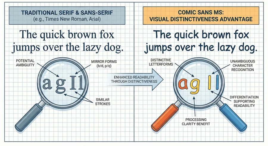 Comic Sans letterforms are visually distinctive. They look different from other sans-serif typefaces. This distinctiveness can make the typeface easier to read for readers who benefit from distinctive, unambiguous letterforms.