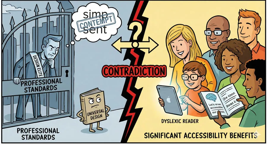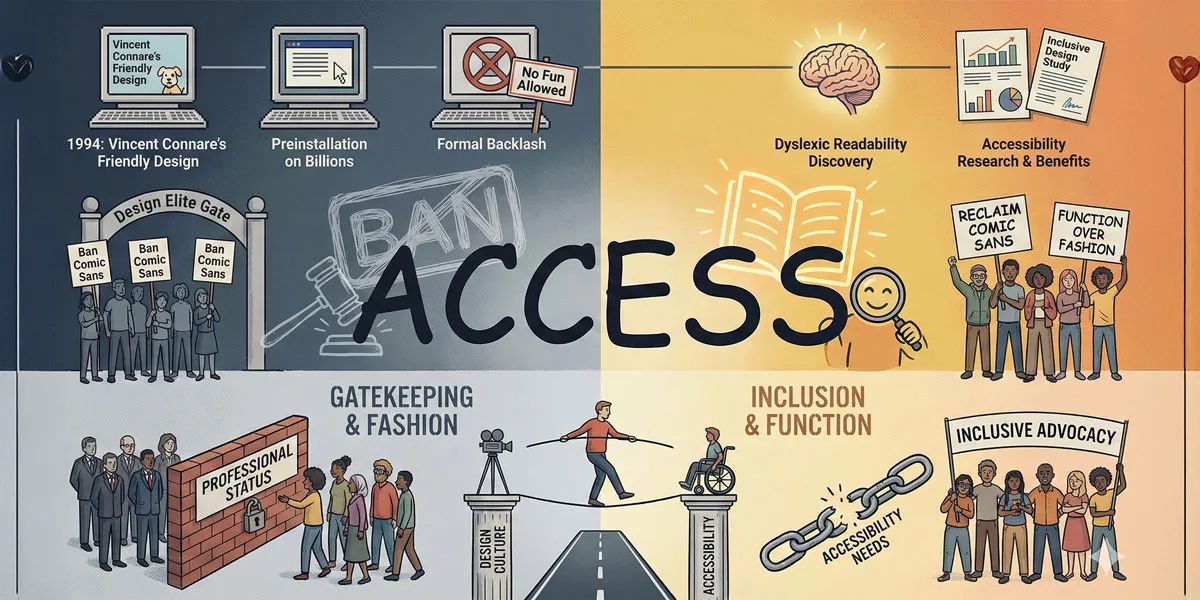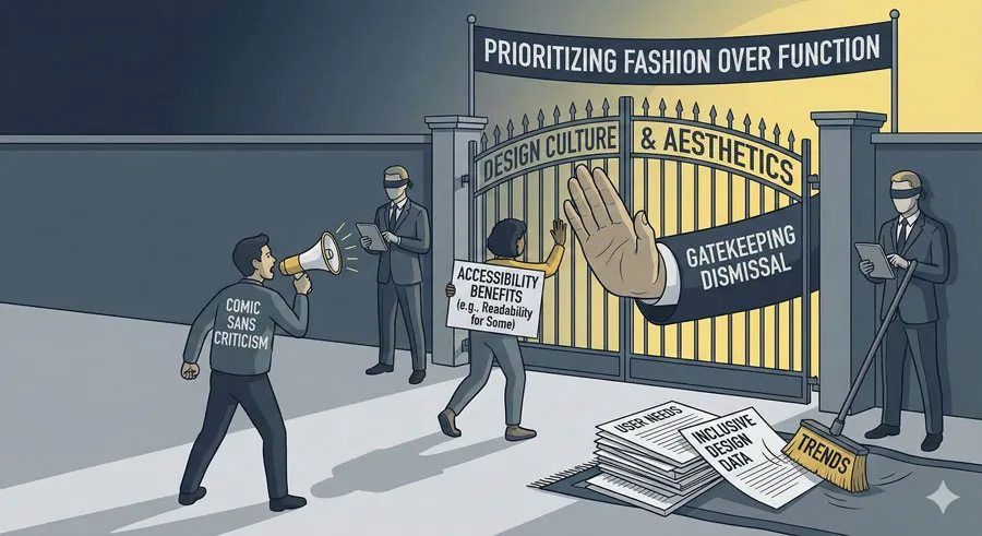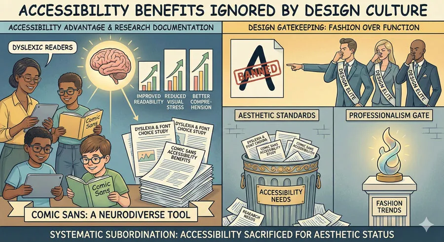 Comic Sans shows what happens when fashion triumphs over user need, when professional status overrides accessibility benefit, when gatekeeping subordinates inclusion.