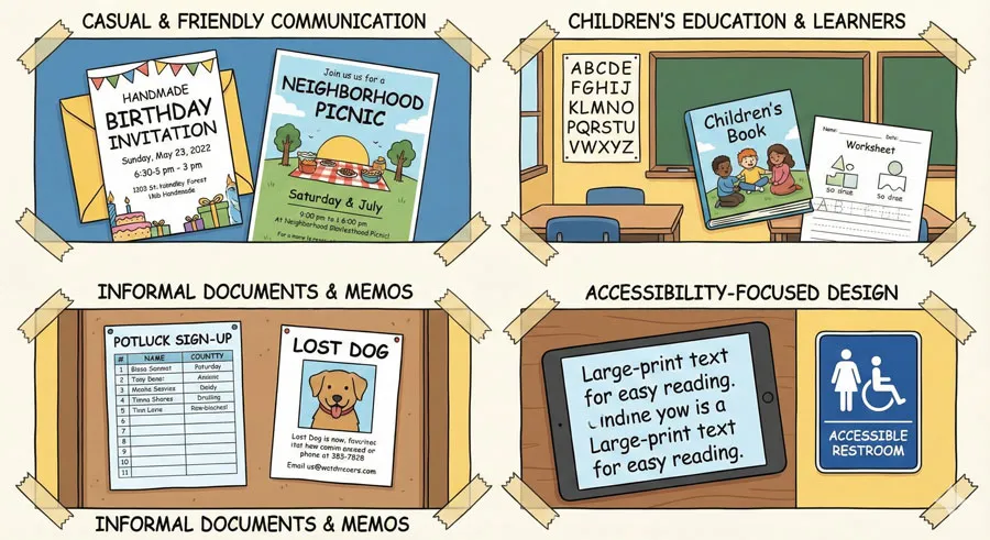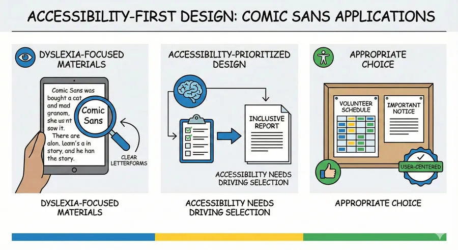In these contexts, accessibility benefits override aesthetic preferences. The question is not whether Comic Sans matches design fashion but whether it serves reader needs.