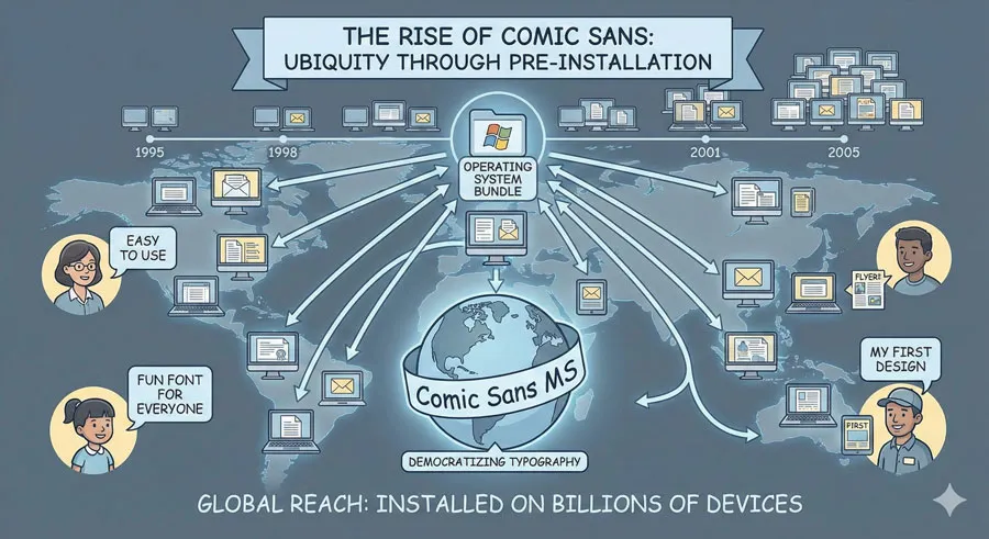 Comic Sans achieved prominence through ubiquity rather than through deliberate design adoption. Because Comic Sans came preinstalled on millions of computers, it became accessible to anyone creating documents. Because the typeface was informal and friendly, it was deployed in countless contexts.