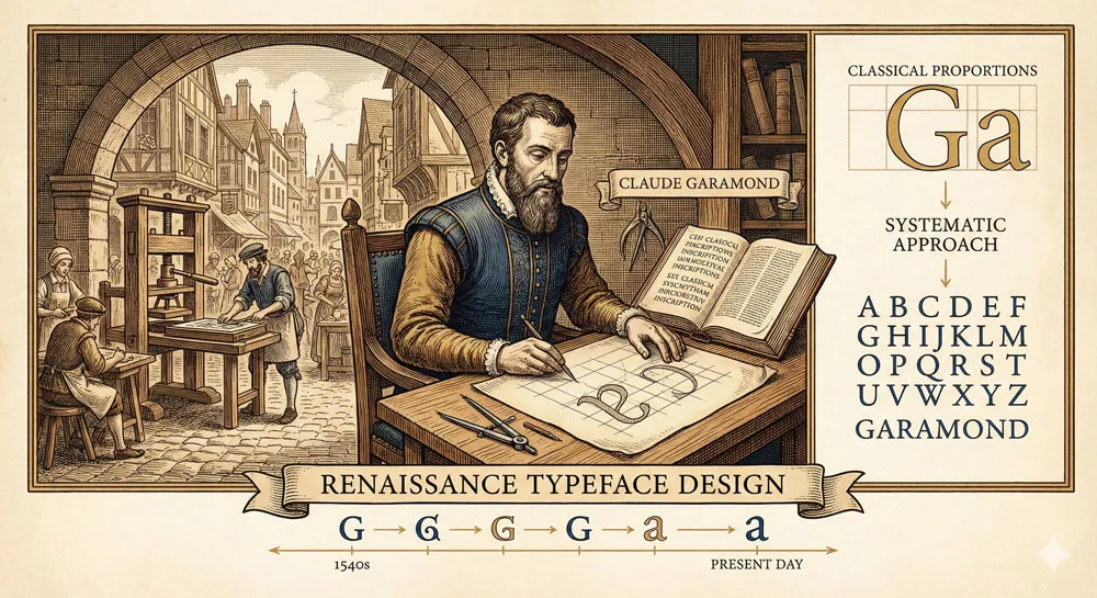 This comprehensive exploration traces Claude Garamond’s life and revolutionary approach to typeface design, examines Garamond typeface characteristics and classical proportions, explores the typeface’s adoption and influence across five centuries, analyses Garamond’s role in book design and literary culture, compares Garamond to other serif typefaces, and ultimately asks: