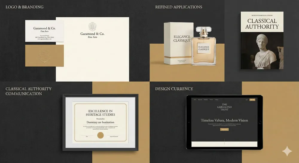 Contemporary designers select Garamond when they want to communicate classical elegance, design understanding, and typographic refinement. Garamond appears in logo design, in branding, in sophisticated design contexts where classical authority is desired.