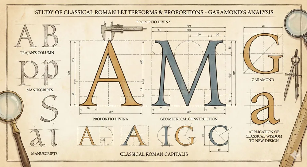 What distinguished Garamond from other punch-cutters was his systematic study of classical Roman letterforms and proportions. Garamond studied Roman inscriptions, examined historical letterforms, and sought to understand the underlying proportional relationships that made classical letters beautiful and readable.