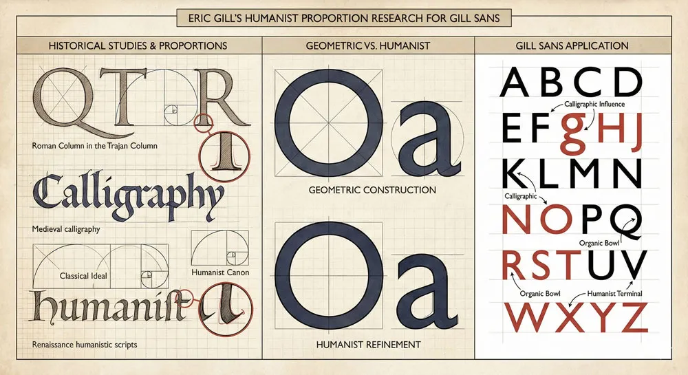 A: Gill Sans is humanist because it is based on human proportions and craft understanding rather than pure geometric principles. The typeface acknowledges traditional letterform proportions developed through centuries of human practice and observation.