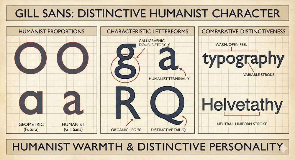 These refinements made Gill Sans warmer and more human than purely geometric sans-serifs.
