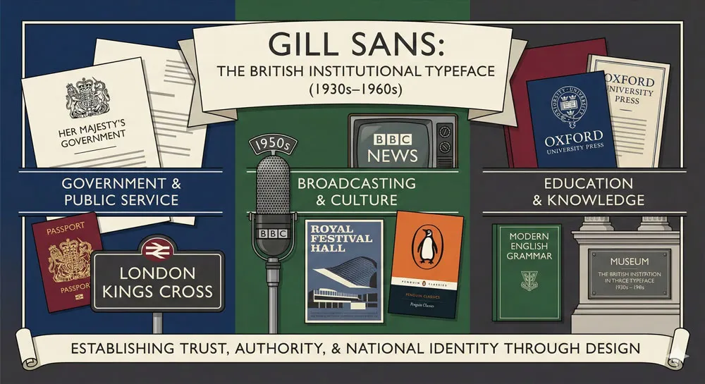 Gill Sans became strongly associated with British institutional and cultural design. The typeface appeared in government communications, educational materials, cultural institutions, and prestigious publications. Gill Sans became visually linked with British professional design and British cultural institutions.