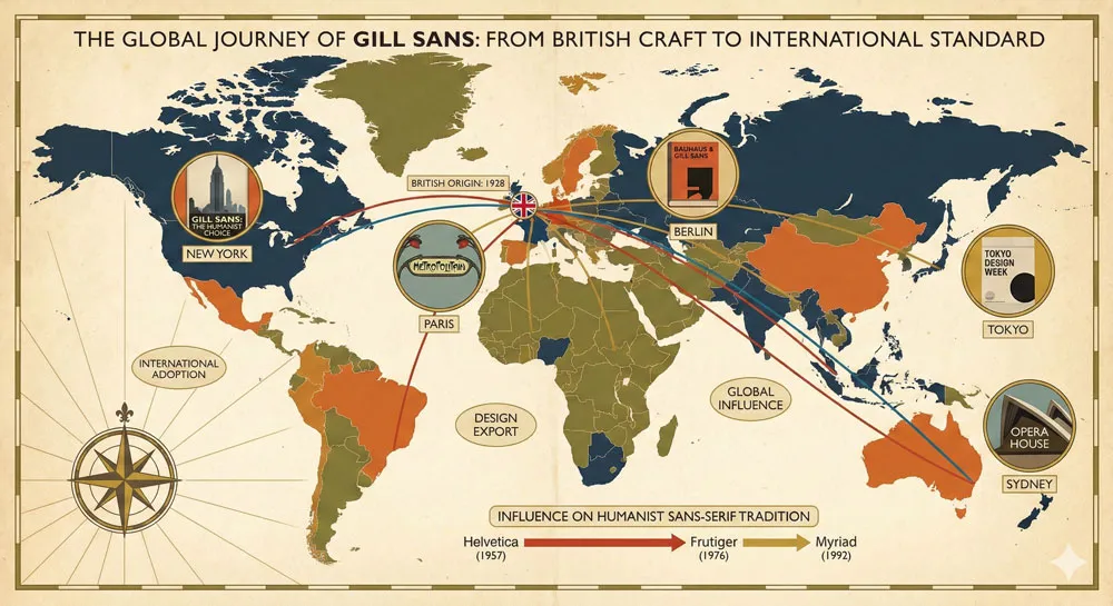 While Gill Sans was particularly prominent in British design contexts, the typeface achieved global adoption throughout the twentieth century. International designers recognized Gill Sans’ quality and appropriateness and selected the typeface for their own projects. Gill Sans appeared in design contexts globally, establishing itself as one of the most significant typefaces of the era.