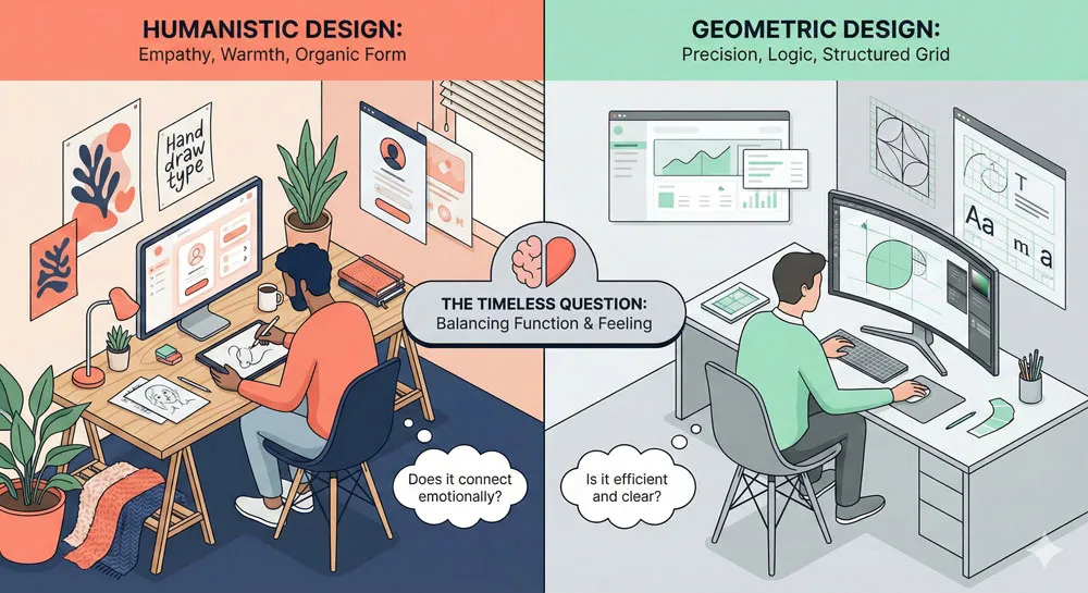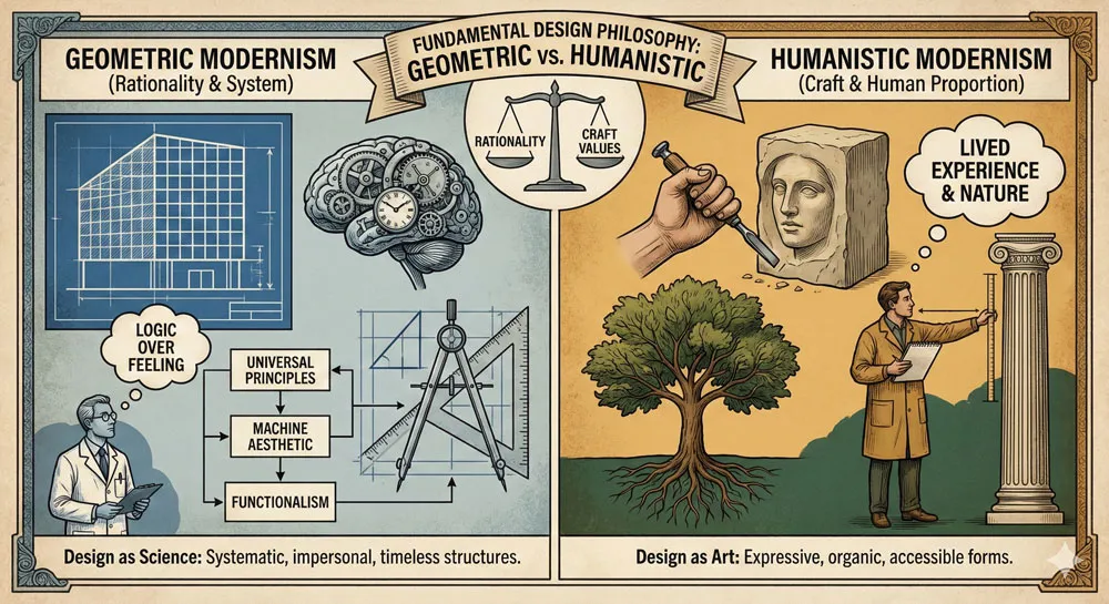 The debate between geometric modernism and humanistic modernism continues in contemporary design. Contemporary designers must decide: should design be based on pure principles and geometric rationality, or should design be grounded in human observation and humanistic understanding? Should design emphasize systematic order, or should it acknowledge human complexity and warmth?