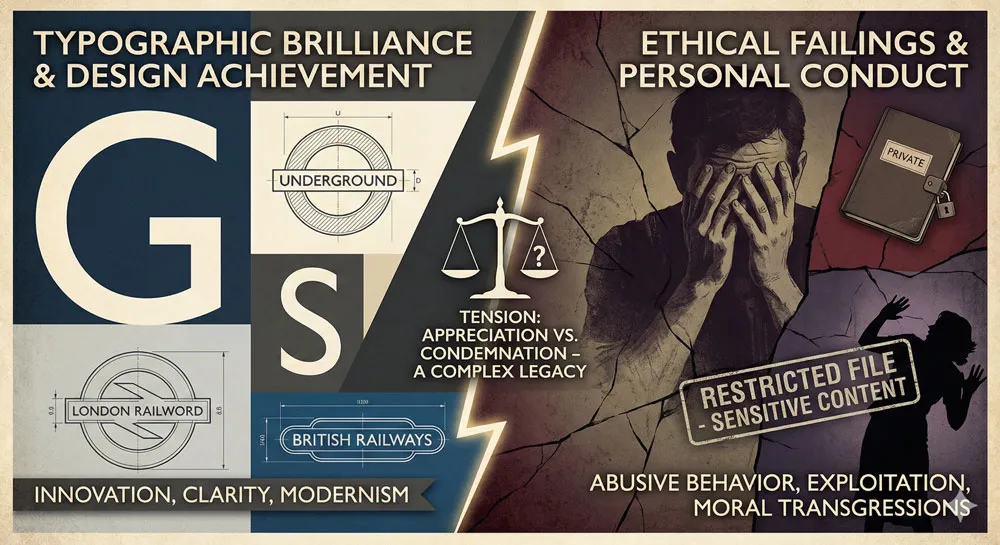 A: Eric Gill’s personal conduct was deeply troubling and would be recognized today as criminal. This complicates his legacy. However, Gill Sans remains a significant and influential design achievement that can be appreciated while condemning Gill’s personal behavior.