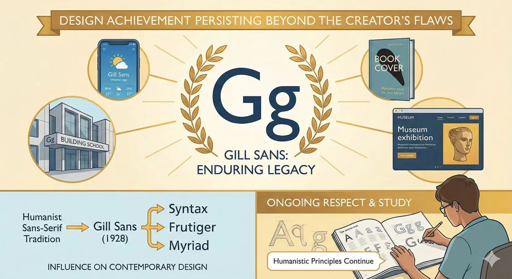 The legacy of Gill Sans is the design achievement itselfโthe humanistic approach to modernist typeface design, the proof that modernism could be warm and human, the demonstration that geometric purity was not necessary for contemporary design. This legacy, while created by a morally flawed individual, remains valuable and influential.