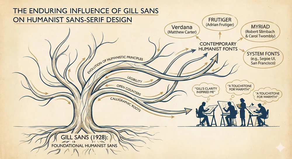 Gill Sans has influenced the entire tradition of humanist sans-serif typeface design. Contemporary humanist sans-serifs like Verdana (designed for screen legibility), system fonts used in contemporary technology, and numerous other contemporary typefaces carry forward the humanistic principles that Gill established.