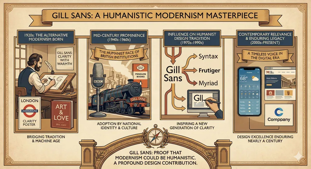 Gill Sans stands as a masterpiece of humanist design and as a crucial alternative path through modernismโone that valued human warmth and craft principle alongside contemporary clarity and functionality.