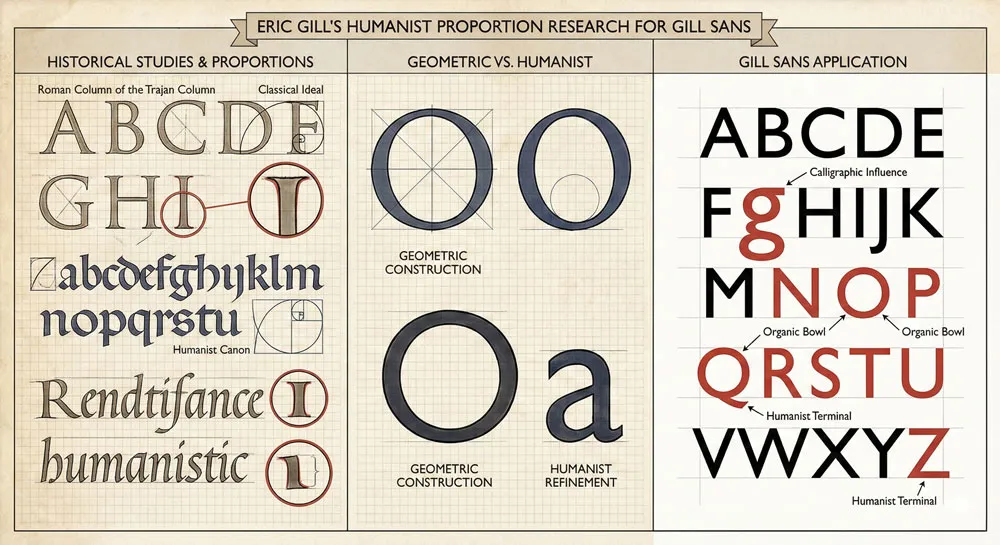 Gill’s design process began with research and observation. Gill studied historical letterforms, examining how proportions and forms developed through centuries of typographic tradition.