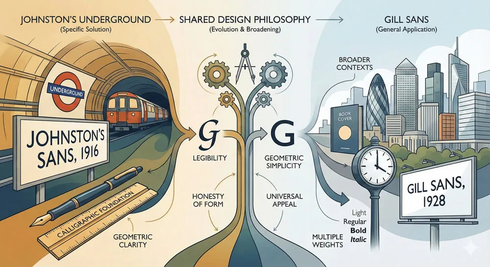 A: Gill studied under Johnston at the Central School of Art. Johnston’s design philosophyโ€”clarity, purpose-driven design, integration of craft and functionโ€”directly influenced Gill’s approach. Gill Sans is an evolution of Johnston’s principles.
