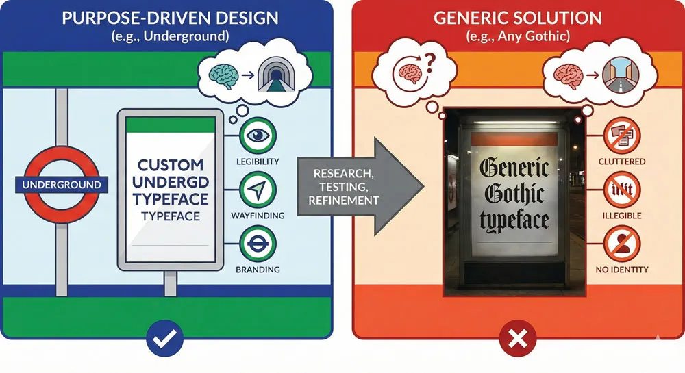 A crucial principle emerging from Johnston’s work is that typefaces should be designed for specific purposes. Johnston didn’t adapt an existing typeface; he created a new typeface specifically for the Underground’s needs.
