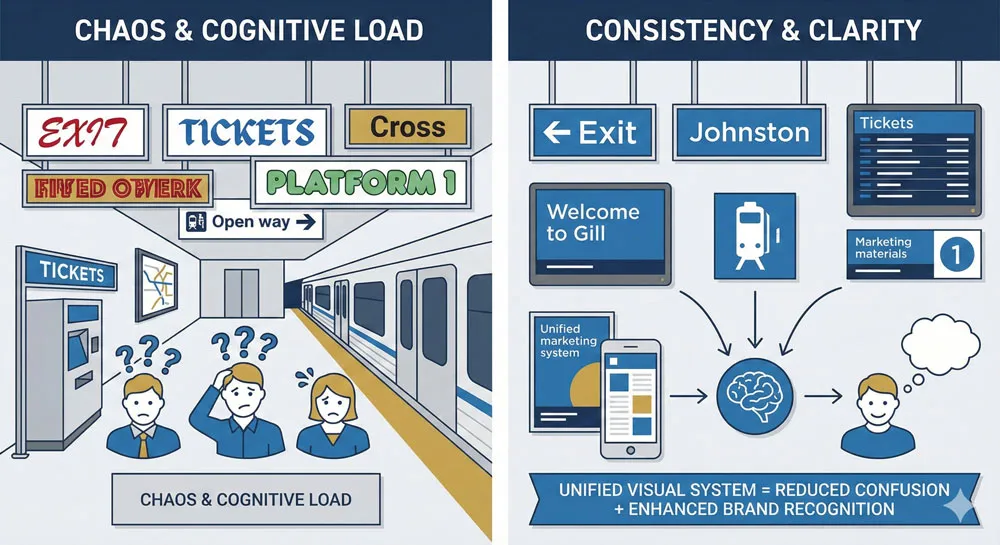 Contemporary branding and design emphasize consistency as crucial for creating recognizable, effective communications. This principle was pioneered through Johnston’s Underground work.
