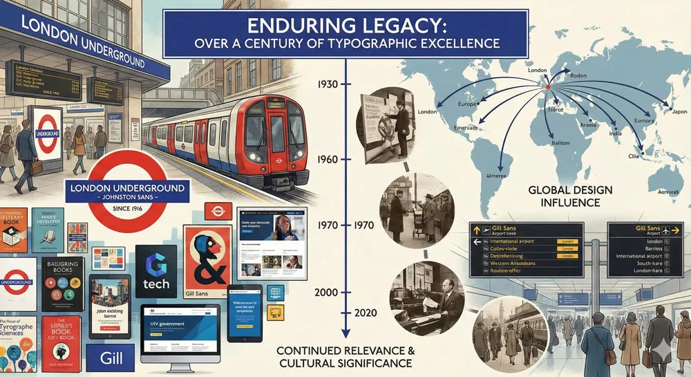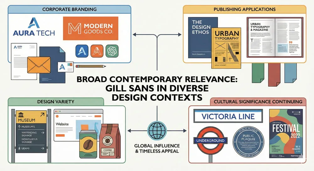 Gill Sans remains one of the most widely used typefaces globally. The typeface appears in corporate branding, publishing, design of all types. The typeface’s connection to London and the Underground gives it distinctive cultural weight.