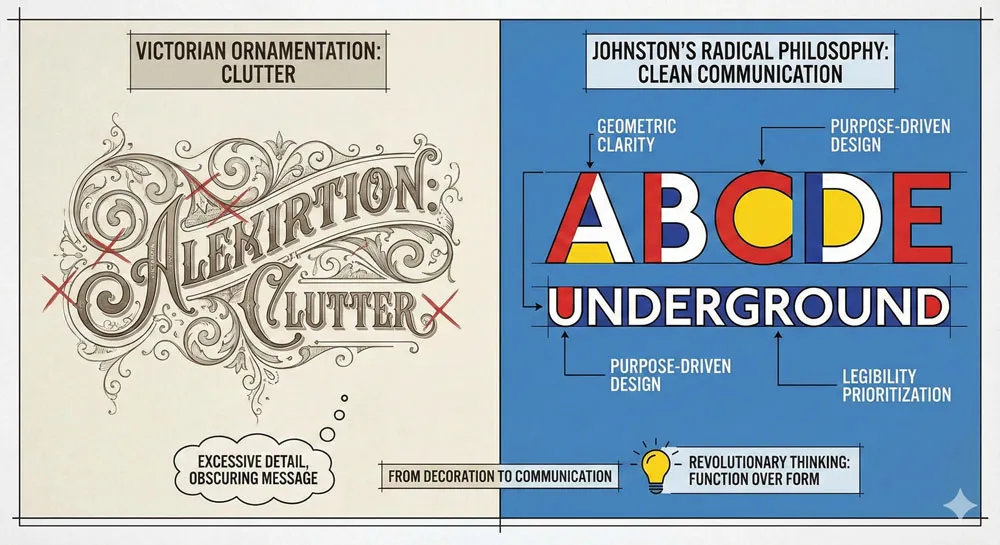 Rather than using an existing classical typeface or creating an ornamental Art Nouveau design (fashionable at the time), Johnston created a radically simplified, geometric sans-serif specifically designed for its purpose.