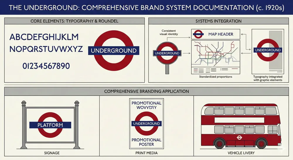 The London Underground and Johnston’s typeface pioneered the concept of using typography as a core element of brand and cultural identity. The Underground created a unified visual system recognizable across all contexts.
