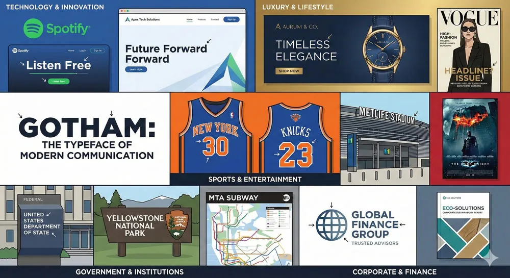 By the 2020s, Gotham has become nearly ubiquitous in contemporary design. The typeface appears on corporate logos, tech company websites, sports branding, government institutions, and countless other contexts.