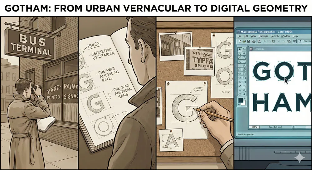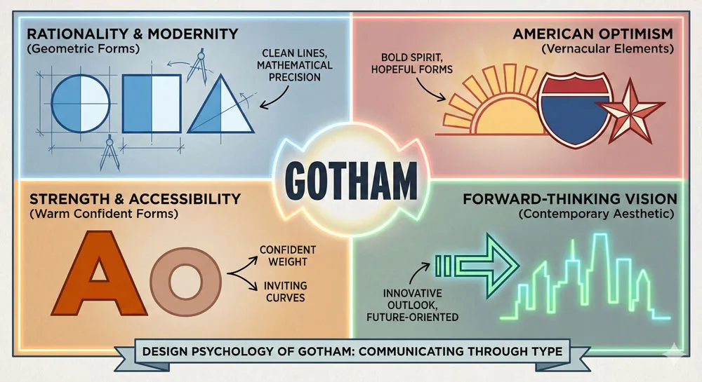 Gotham emerges from this tradition of American sans-serif design. It is simultaneously a geometric sans-serif (connecting it to European modernism and design rationality) and a distinctly American typeface (incorporating American vernacular character and confidence).