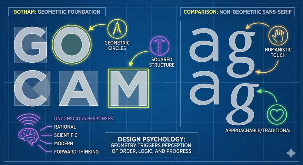 Gotham, by contrast, maintains geometric confidence while incorporating humanistic warmth. Gotham communicates optimism and modernity, but feels more accessible and approachable than Futura.