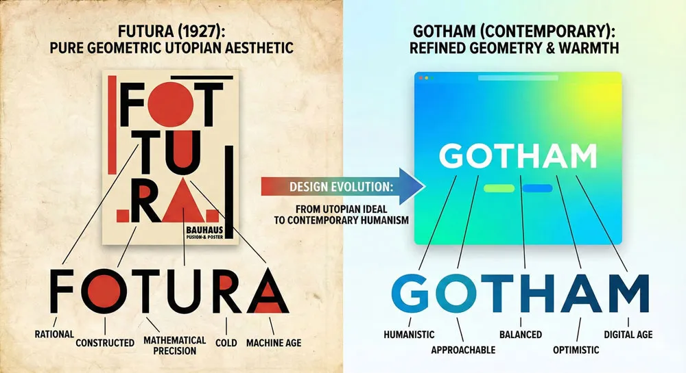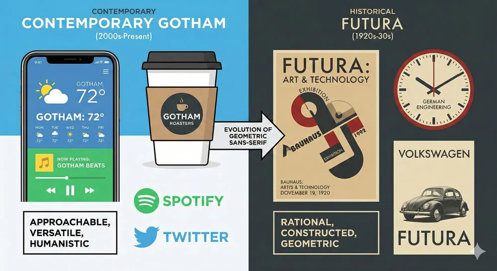 Comparing Gotham to Futura, the quintessential geometric sans-serif from which Gotham draws inspiration, reveals how contemporary typeface design builds on but also differs from historical traditions.
