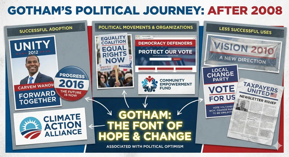 Gotham communicated optimism, forward-thinking progress, American strength, and contemporary vision. It was, in many ways, the perfect visual embodiment of the “Hope and Change” message that defined the 2008 Obama campaign.