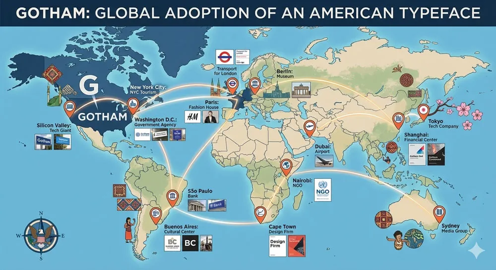 While Gotham emerged from American design traditions and was popularized through an American political campaign, the typeface has been adopted globally.