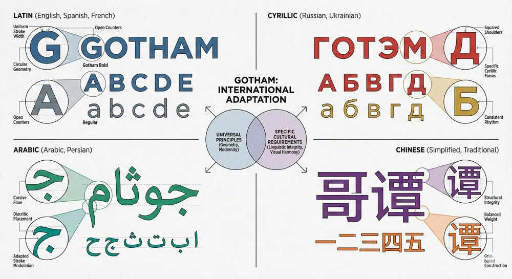 Some organizations have commissioned adaptations of Gotham for non-Latin writing systems (Cyrillic, Arabic, Chinese characters). These adaptations attempt to maintain Gotham’s distinctive character while functioning appropriately for specific writing systems.