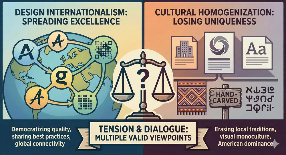 This can be understood as positive (excellent design is recognized and adopted globally) or negative (local design traditions and visual diversity are erased in favor of American design exports). Both perspectives contain truth.