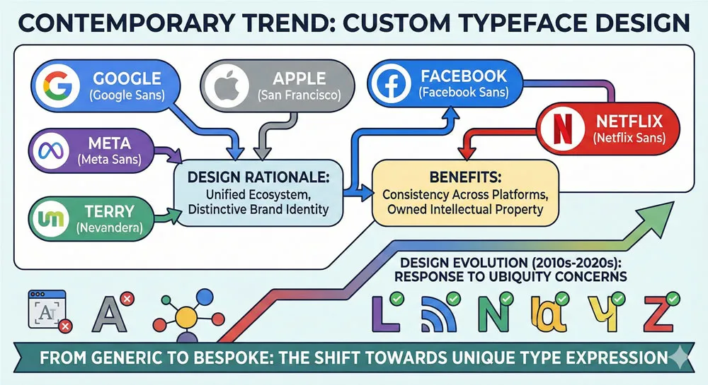 Rather than adopting existing typefaces like Gotham, major companies commission custom typefaces designed specifically for their brands. Google (Roboto), Facebook (various custom typefaces), Apple (San Francisco), and others have created custom typefaces rather than defaulting to existing options.