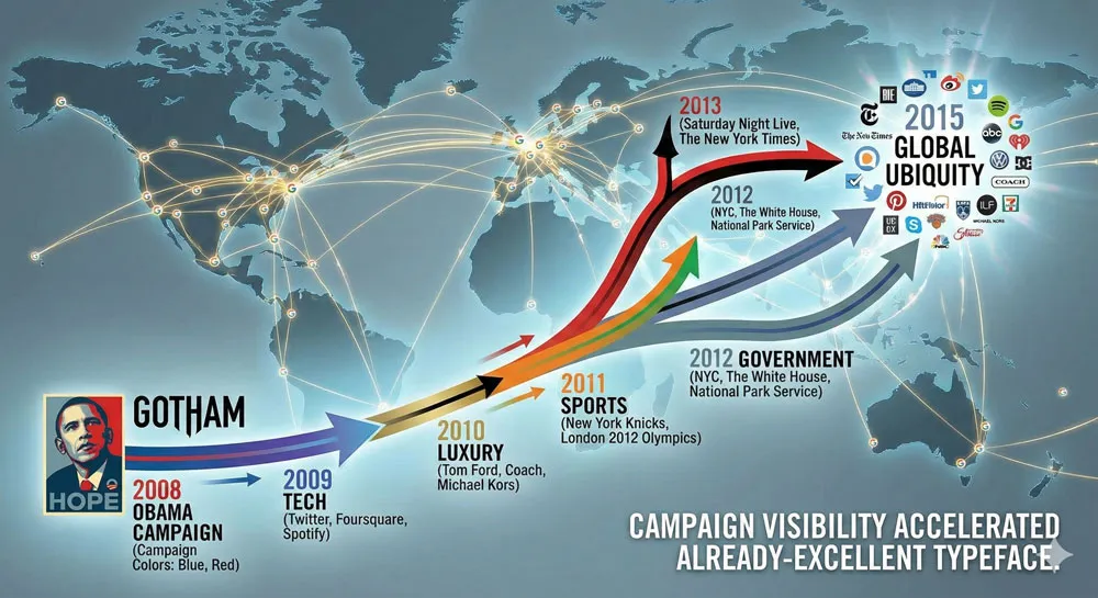 Most typefaces remain known primarily to design professionals. Gotham has become known to millions of people worldwide through its association with a significant political campaign and its subsequent adoption across industries and contexts.