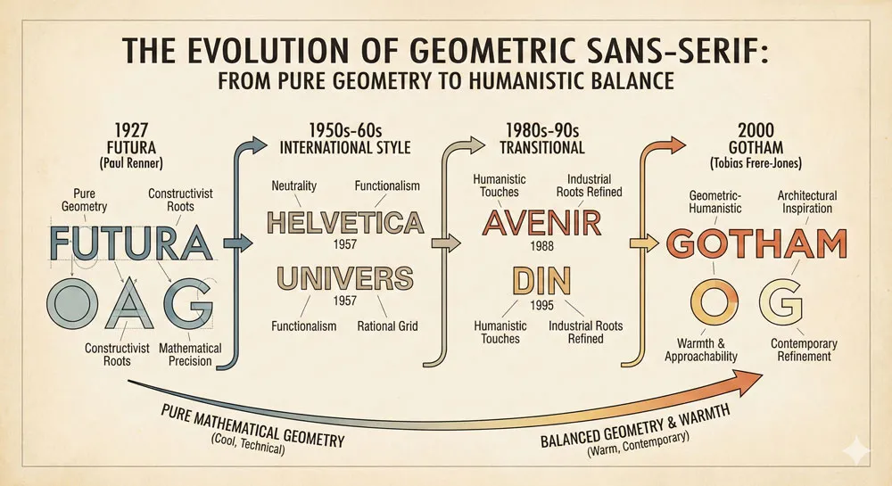 Contemporary geometric sans-serifs like Gotham maintain modernist principles while incorporating humanistic refinement.