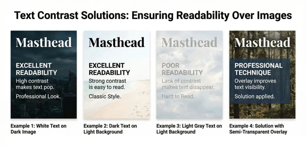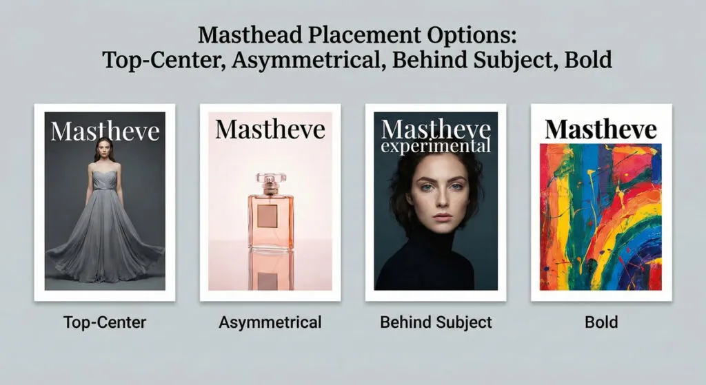Most mastheads are positioned at the top but premium magazines sometimes place them off-centre or partially obscured by the subject for more sophisticated visual impact.