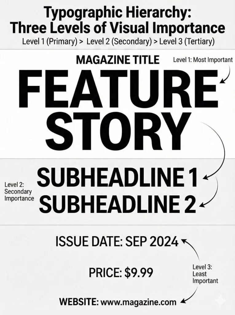 Visual hierarchy determines what readers see first, second and third. Without clear hierarchy, all elements scream equally loudly and nothing stands out. We’ll discuss this extensively when we cover typography.